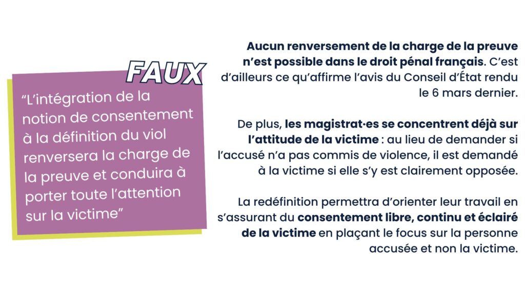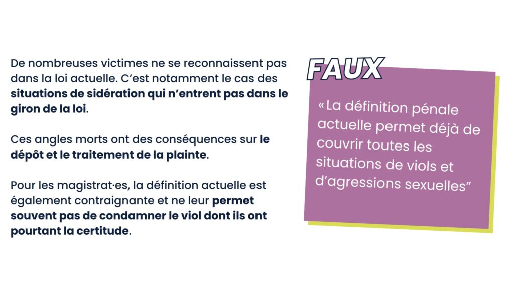 Nous en sommes convaincu·es, pour chan­ger de sys­tème, il faut d’abord chan­ger la loi. Il faut ins­crire dans le marbre qu’un rap­port sexuel non libre­ment consen­ti est un viol et que la zone grise n’existe pas. Céder ce n’est pas consen­tir.